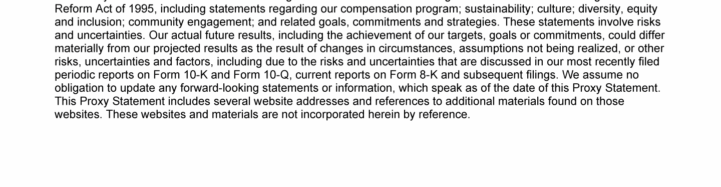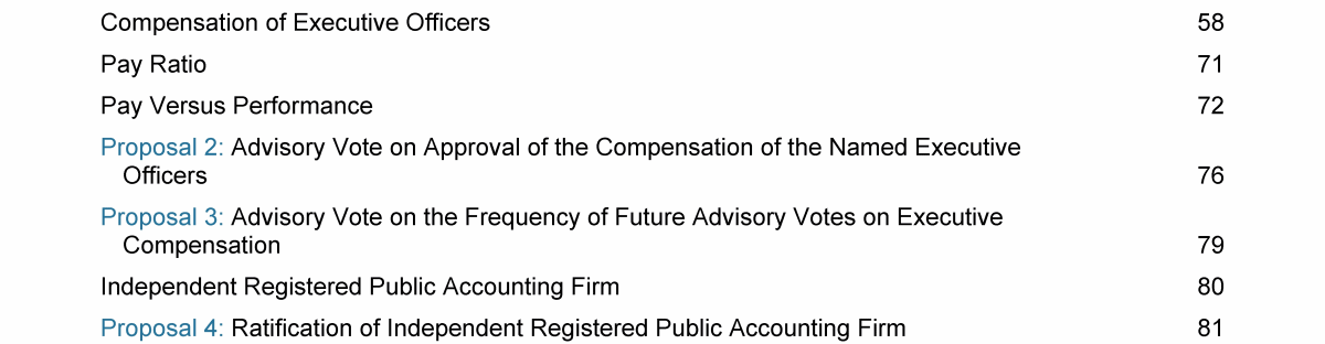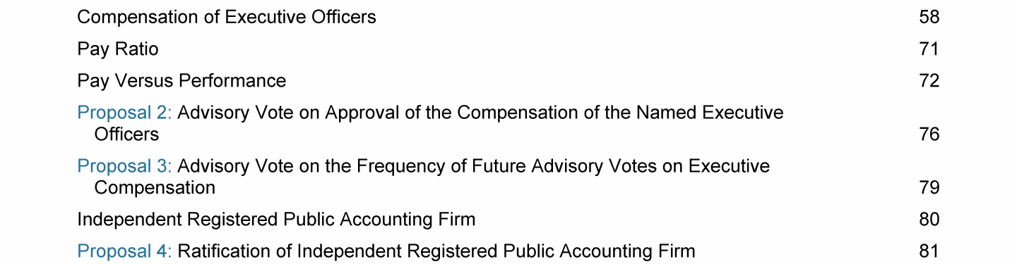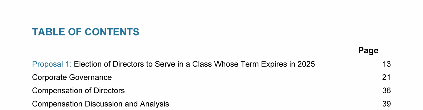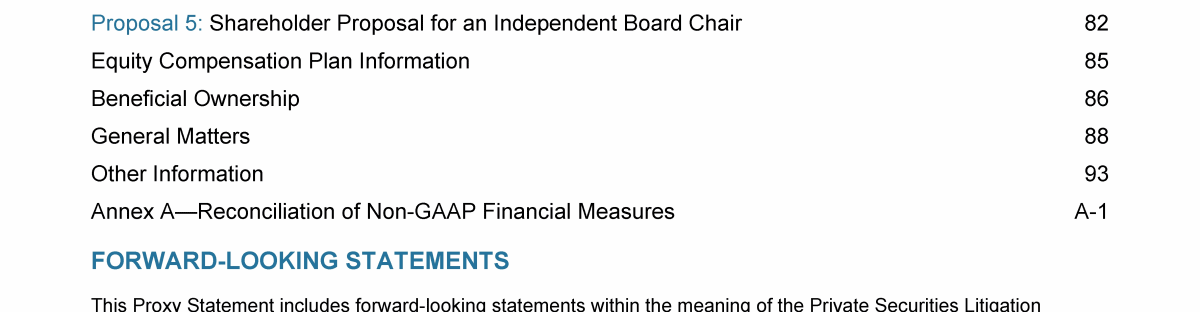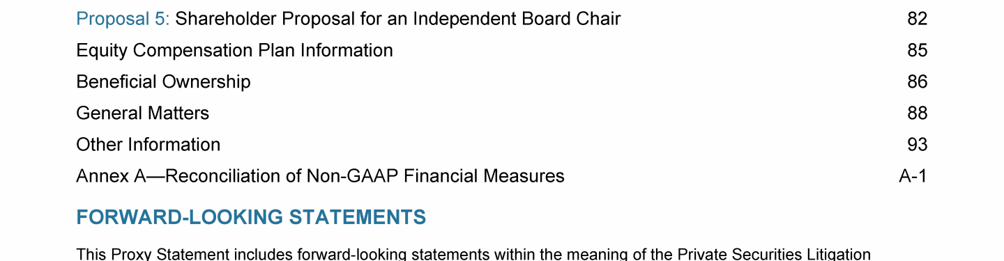 Click to view Proposal 1: Election of Directors to Serve in a Class Whose Term Expires in 2025 Click to view Corporate Governance Click to view Compensation of Directors Click to view Compensation Discussion and Analysis Click to view Proposal 1: Election of Directors to Serve in a Class Whose Term Expires in 2025 Click to view Corporate Governance Click to view Compensation of Directors Click to view Compensation Discussion and Analysis Click to view Proposal 1: Election of Directors to Serve in a Class Whose Term Expires in 2025 Click to view Corporate Governance Click to view Compensation of Directors Click to view Compensation Discussion and Analysis Click to view Compensation of Executive Officers Click to view Pay Ratio Click to view Pay Versus Performance Click to view Proposal 2: Advisory Vote on Approval of the Compensation of the Named Executive Officers Click to view Proposal 3: Advisory Vote on the Frequency of Future Advisory Votes on Executive Compensation Click to view Independent Registered Public Accounting Firm Click to view Proposal 4: Ratification of Independent Registered Public Accounting Firm Click to view Compensation of Executive Officers Click to view Pay Ratio Click to view Pay Versus Performance Click to view Proposal 2: Advisory Vote on Approval of the Compensation of the Named Executive Officers Click to view Proposal 3: Advisory Vote on the Frequency of Future Advisory Votes on Executive Compensation Click to view Independent Registered Public Accounting Firm Click to view Proposal 4: Ratification of Independent Registered Public Accounting Firm Click to view Compensation of Executive Officers Click to view Pay Ratio Click to view Pay Versus Performance Click to view Proposal 2: Advisory Vote on Approval of the Compensation of the Named Executive Officers Click to view Proposal 3: Advisory Vote on the Frequency of Future Advisory Votes on Executive Compensation Click to view Independent Registered Public Accounting Firm Click to view Proposal 4: Ratification of Independent Registered Public Accounting Firm Click to view Proposal 5: Shareholder Proposal for an Independent Board Chair Click to view Equity Compensation Plan Information Click to view Beneficial Ownership Click to view General Matters Click to view Other Information Click to view Annex A - Reconciliation of Non-GAAP Financial Measures Click to view Proposal 5: Shareholder Proposal for an Independent Board Chair Click to view Equity Compensation Plan Information Click to view Beneficial Ownership Click to view General Matters Click to view Other Information Click to view Annex A - Reconciliation of Non-GAAP Financial Measures Click to view Proposal 5: Shareholder Proposal for an Independent Board Chair Click to view Equity Compensation Plan Information Click to view Beneficial Ownership Click to view General Matters Click to view Other Information Click to view Annex A - Reconciliation of Non-GAAP Financial Measures Click to view Proposal 1: Election of Directors to Serve in a Class Whose Term Expires in 2025 Click to view Corporate Governance Click to view Compensation of Directors Click to view Compensation Discussion and Analysis Click to view Compensation of Executive Officers Click to view Pay Ratio Click to view Pay Versus Performance Click to view Proposal 2: Advisory Vote on Approval of the Compensation of the Named Executive Officers Click to view Proposal 3: Advisory Vote on the Frequency of Future Advisory Votes on Executive Compensation Click to view Independent Registered Public Accounting Firm Click to view Proposal 4: Ratification of Independent Registered Public Accounting Firm Click to view Proposal 5: Shareholder Proposal for an Independent Board Chair Click to view Equity Compensation Plan Information Click to view Beneficial Ownership Click to view General Matters Click to view Other Information Click to view Annex A - Reconciliation of Non-GAAP Financial Measures Click to view Proposal 1: Election of Directors to Serve in a Class Whose Term Expires in 2025 Click to view Corporate Governance Click to view Compensation of Directors Click to view Compensation Discussion and Analysis Click to view Compensation of Executive Officers Click to view Pay Ratio Click to view Pay Versus Performance Click to view Proposal 2: Advisory Vote on Approval of the Compensation of the Named Executive Officers Click to view Proposal 3: Advisory Vote on the Frequency of Future Advisory Votes on Executive Compensation Click to view Independent Registered Public Accounting Firm Click to view Proposal 4: Ratification of Independent Registered Public Accounting Firm Click to view Proposal 5: Shareholder Proposal for an Independent Board Chair Click to view Equity Compensation Plan Information Click to view Beneficial Ownership Click to view General Matters Click to view Other Information Click to view Annex A - Reconciliation of Non-GAAP Financial Measures